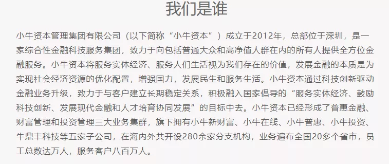 小牛资本官网介绍,其成立于2012年,旗下平台包括小牛普惠、小牛在线、小牛新财富、小牛投资和牛鼎丰科技;涉及普惠金融、财富管理和投资管理业务。2020年10月23日,中基协公告称,注销7家机构私募基金管理人登记,其中包括小牛投资。公开资料显示,小牛投资是小牛资本旗下私募,头部P2P平台小牛在线的兄弟公司。