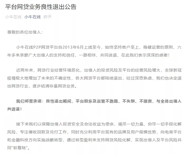 当时小牛在线表示,近两年来,网贷行业经营环境恶化,出借人的投资风险及平台的经营风险增大,全球新冠疫情极大地增加了未来的不确定性,各大网贷平台都陆续退出,经过深思熟虑,我们也决定退出网贷行业,逐步结清存量网贷业务。我们郑重承诺:良性退出期间,平台股东及高管不跑路、不失联、不撤资,与全体出借人共进退!
