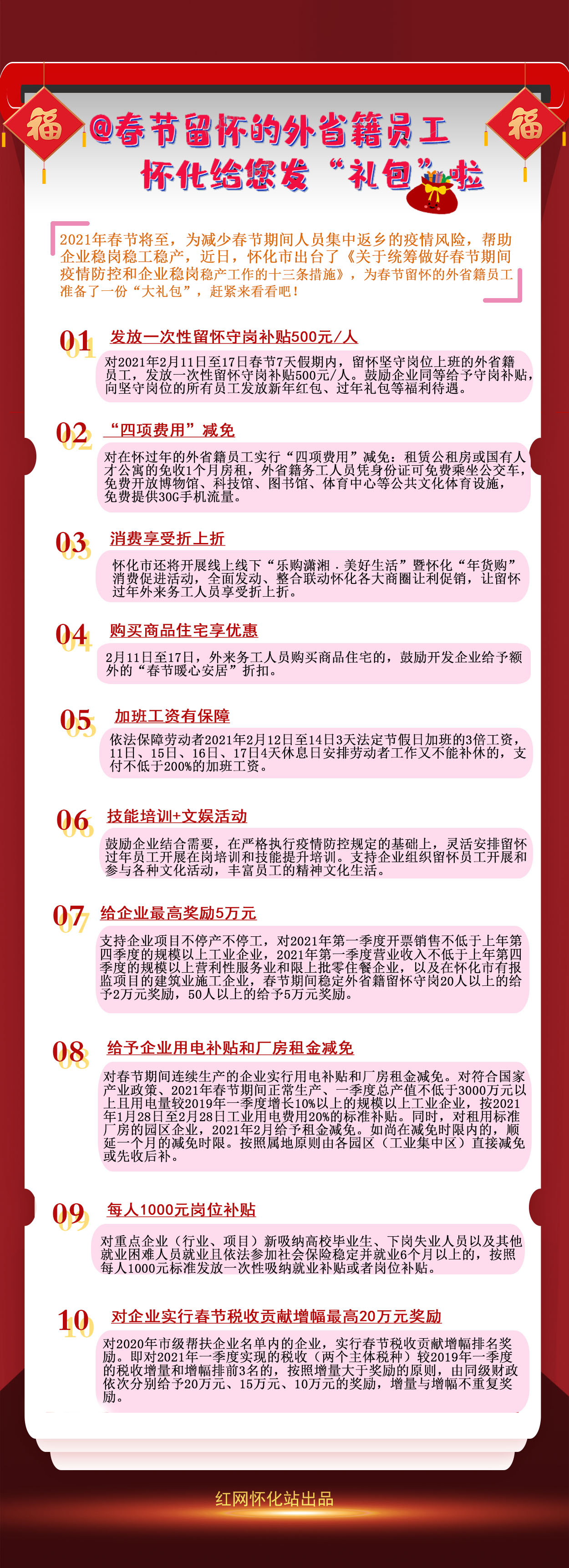 近日,怀化市出台了《关于统筹做好春节期间疫情防控和企业稳岗稳产工作的十三条措施》,激励全市外来务工人员安心留怀过年,巩固疫情防控和经济社会发展成果。