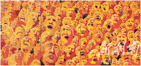 暖黄色的画面,犹如阳光下看热闹的人群,通过他们不同的面部表情刻画,弱化了个体之间的差异性,从而形成具有时代符号的一堵面孔墙。