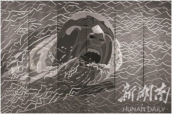 这件木刻版画是方力钧艺术生涯中觉醒期的代表作,由黑白灰构建而成的单色阶画面,采用近景特写的方式把局部放大,运用刻刀和电锯产生的不同线条,表现“无名人物”在水中奋力拼搏的一幕,隐喻或聚焦的是当下个体的生存状态。