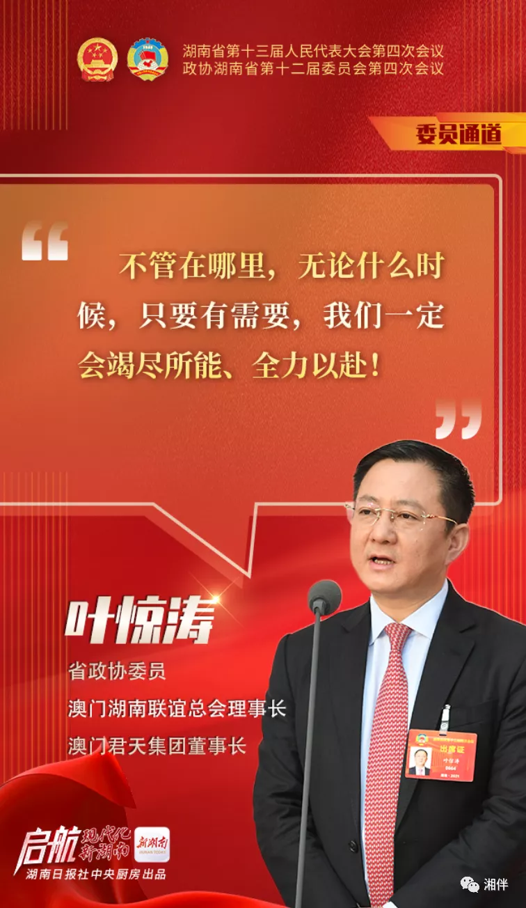 作为湖南籍政协委员,叶惊涛一直坚持以实际行动为家乡做点实事:“不管在哪里,无论什么时候,只要有需要,我们一定会竭尽所能、全力以赴!体现中国精神、湖南力量的委员担当”。