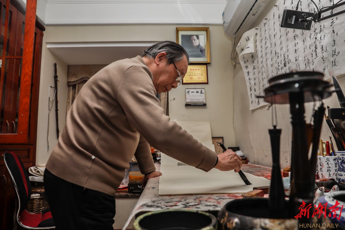 “我最喜欢的便是毛泽东笔下的《红军不怕远征难》,不仅诗意气壮山河,更兼笔意气势磅礴。”他告诉记者,他书法道路上的启蒙老师是毛泽东主席的“毛体”。从少年时就喜爱毛体,并不断研学毛体,还发现毛体在各个时代的状态有很大的差异,各有巧妙不同。这个习惯,贯穿了他从少年到中年的全过程,不管是在学校还是军营,不管是挥毫下笔还是临空摹划,主席的诗、书、意都深深地刻画在他的脑海中。随后,他开始研习柳体、曹全碑等字体,并不断学习吸收了更多书法流派的精华。