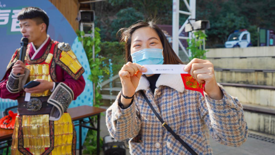 石燕湖景区结合民俗文化,特别推出新春祈福游园特色文化演艺:“财神”从游客中心一路向大家派发代表好运和福气的金币巧克力和糖果。到达迎宾广场后,开启财神祈福仪式,同时金狮舞动表演,与游客们现场互动,还可以凭门票在财神的聚宝盆抽取丰厚大奖!