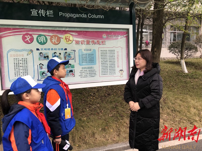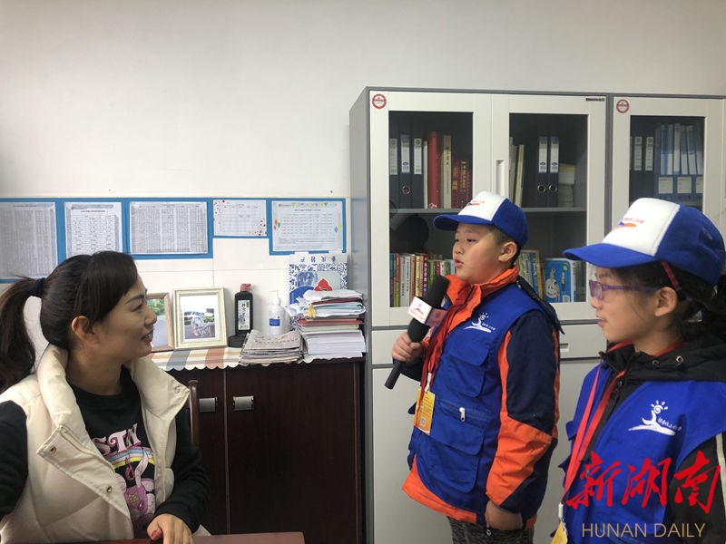 祝融小学政教主任肖慧接受了小记者李政柯、邹晨希的体验采访,她告诉小记者学校的德育教育是在幸福教育的理念下根据学生的天性和年龄特点开展丰富多彩的活动,让学生体验到幸福快乐。