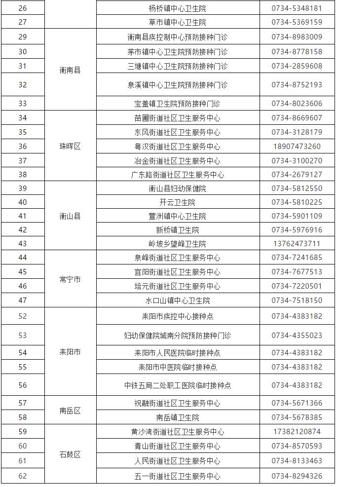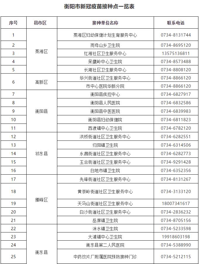 新冠疫苗接种是预防新冠肺炎最科学、最有效、最简单的办法,也是形成人群免疫屏障、有效控制疫情的措施之一。为全面提高新冠疫苗接种率,引导各类重点人群积极接种新冠疫苗,现将衡阳市新冠疫苗接种点名单公布如下: