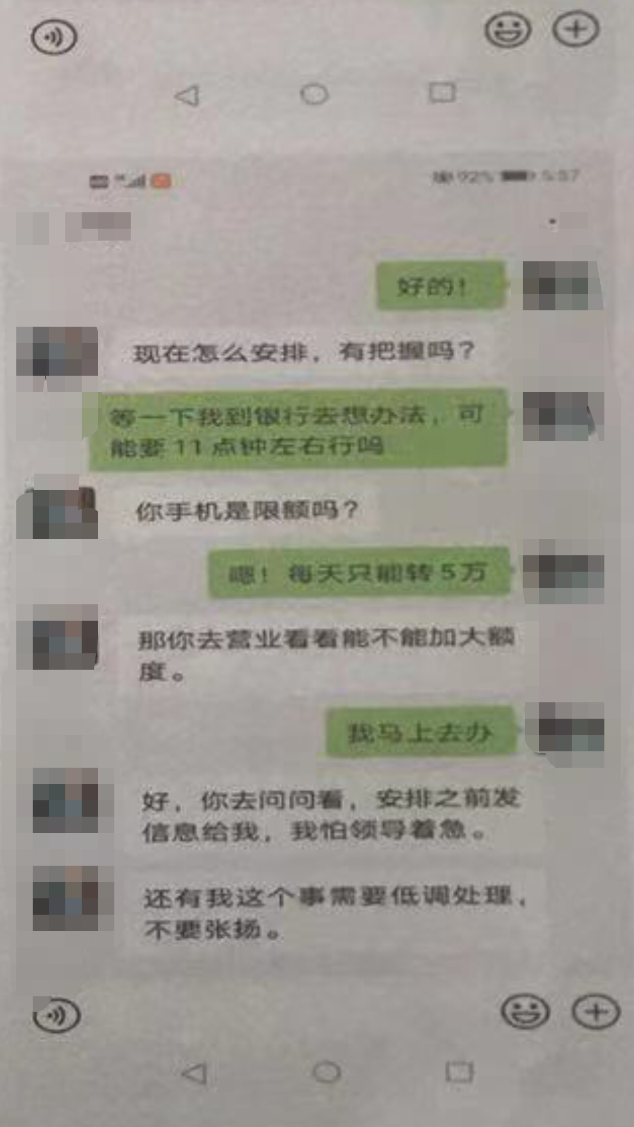 正当受害人感觉与“领导”的关系已更进一步时,骗子开始露出真面目,编造“急用钱,但自己不方便操作,代为转账”等理由实施诈骗。更有骗子会抓住受害人对领导的敬畏心理,频繁使用“尽快”“马上”“立即”命令式口吻,营造紧张气氛,降低受害人核实转账需求真假的可能性。