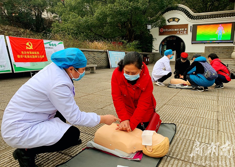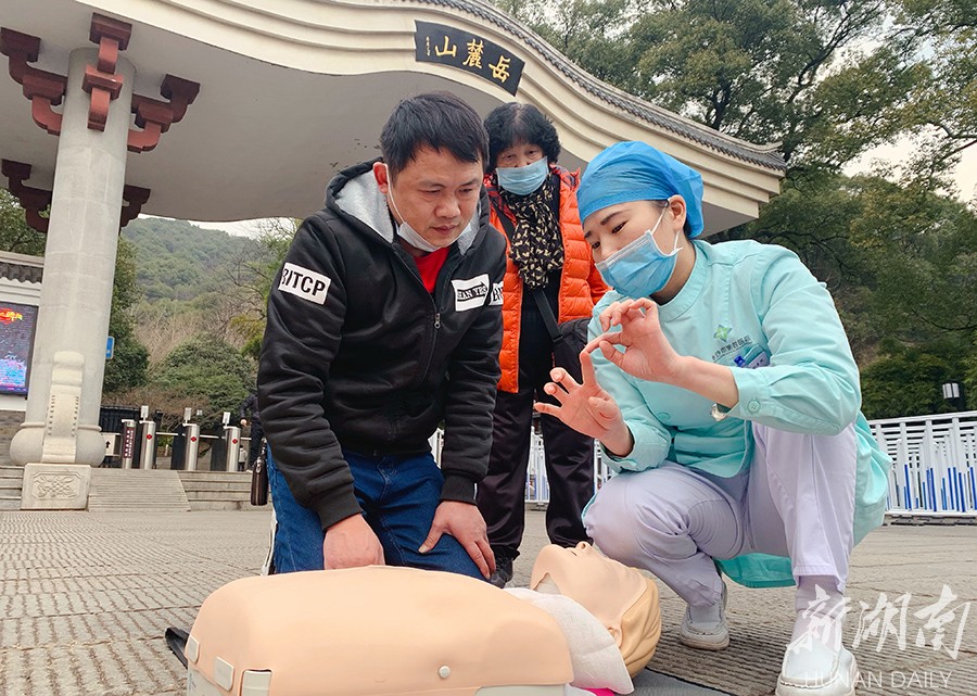 1月20日,长沙岳麓山东门广场,长沙市第四医院志愿服务队在义务指导游客如何进行心肺复苏急救操作。当天,是“国家急救日”,该院开展急救大课堂公益培训志愿服务活动,旨在让公共急救知识和技能进一步得到普及,也让更多的“意外”在紧急关头能得到有效救治。湖南日报·新湖南客户端记者 徐行 摄
