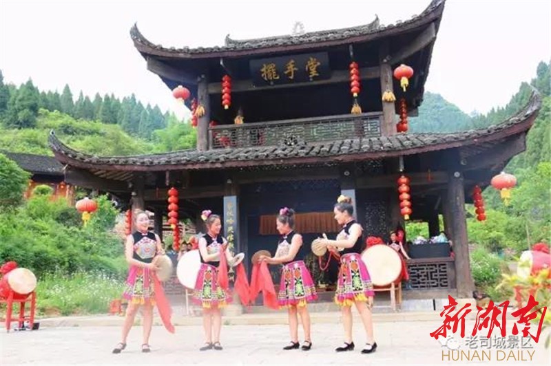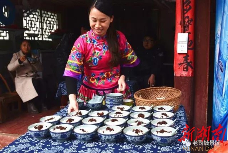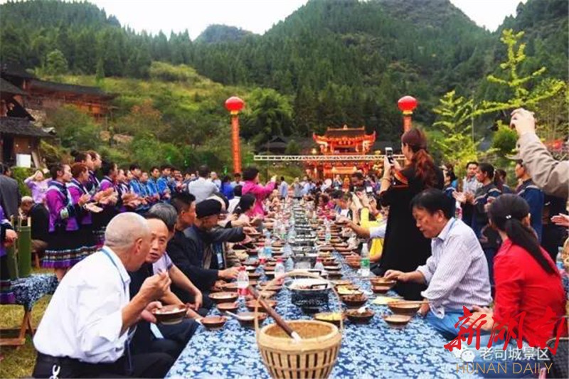 长龙宴: 土家族人过年,讲的是合家团圆的欢乐,过年之前,远离千里之外的亲人也要赶回家来。在老司城,长龙宴往往是几十上百张桌子接龙周转摆放,一定在寨子最宽敞的地方,是待人接客最诚恳最隆重的宴请方式。无论是远道而来的游客,还是本地居民,只要你找到座位就可以尽情地享用长龙宴大餐,体会土家人的赶年味。穿着盛装的土家族姑娘们,端起小酒杯,边舞边唱。唱一首歌,喝一杯酒,歌来酒往,杯盏交错,已分不出主客,每个人都融入到喜庆氛围里。