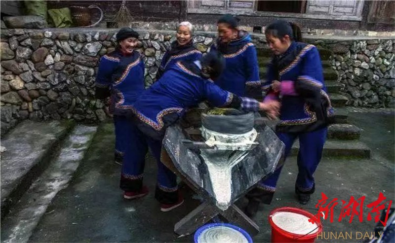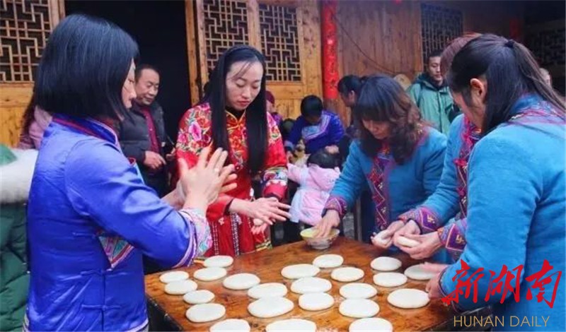 打糍粑:土家族人普遍流行着一种过年“打粑粑”的习俗。土家人素有“二十八、打粑粑”的说法。每逢春节来临,农历腊月二十八,家家都要打糯米糍粑。打糯米糍粑是一项劳动强度较大的体力活,一般都是后生男子汉打,两个人对站,先揉后打,即使冰雪天也要出一身汗。做粑粑也很讲究,手粘蜂腊或茶油,先出坨,后用手或木板压,要做得玉圆光滑,讲究美观。