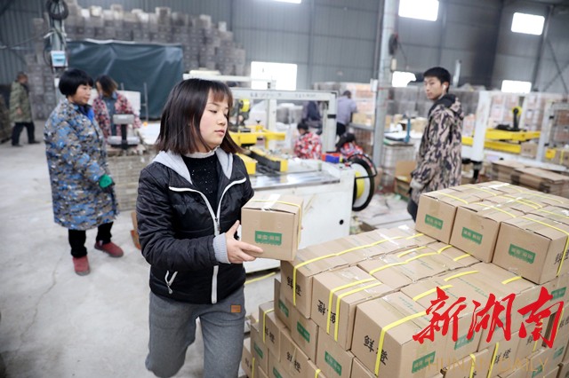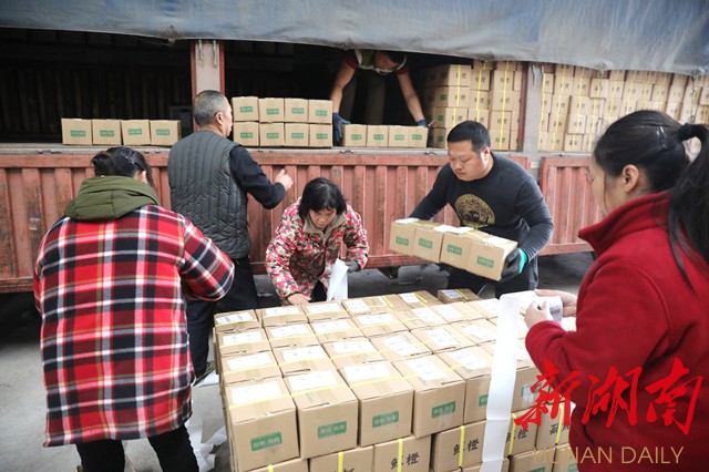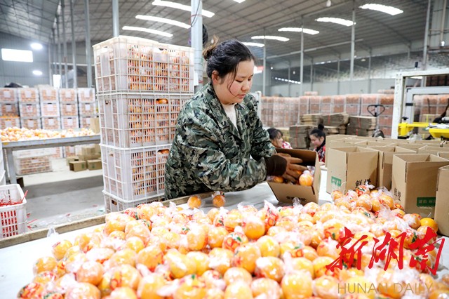 1月27日,在麻阳苗族自治县高村镇一公司的仓库基地,员工们正把一筐筐皮靓、味美的纽荷尔脐橙打包、分级,准备发往湖北省黄石市。