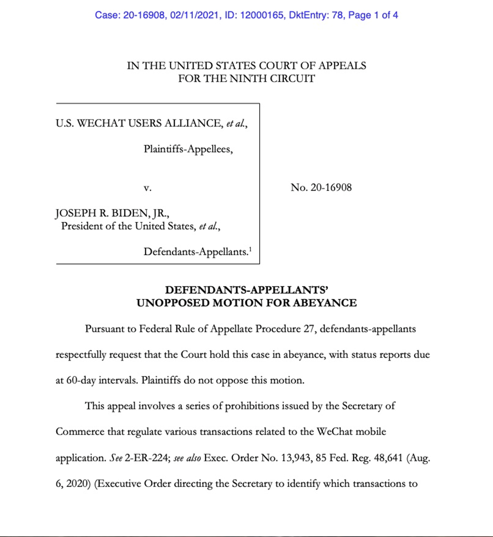 这些沟通得到了积极的结果。一个月后,拜登新政府在农历除夕(2月11日)宣布,已提交申请,要求上诉法院暂停审理微信禁令案件。司法部称,正在重新评估特朗普的总统令,之后上诉案讨论的问题范围可能会缩小,上诉甚至可能撤销。