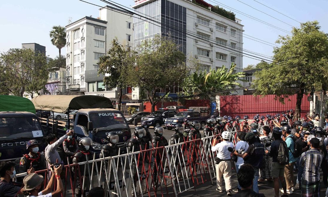 缅甸军警15日封锁了缅甸全国民主联盟总部 图源:央视新闻