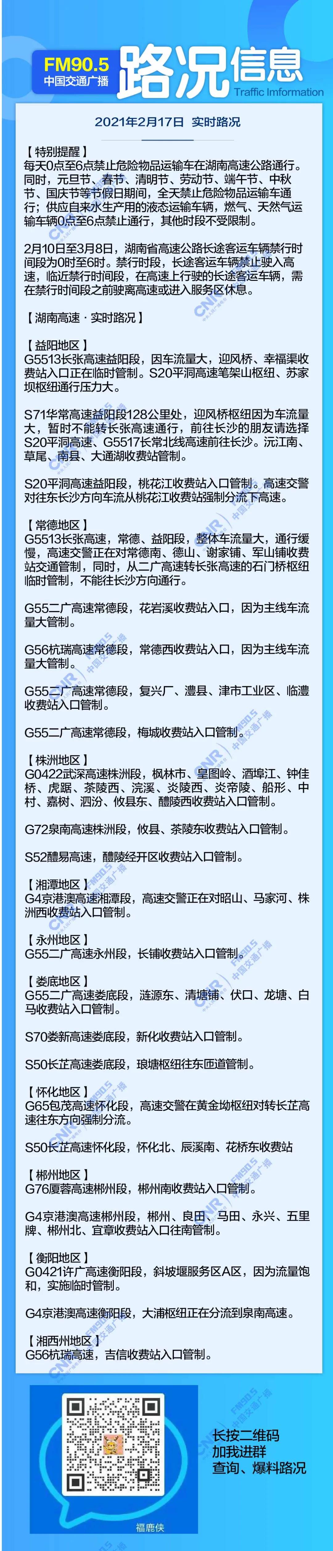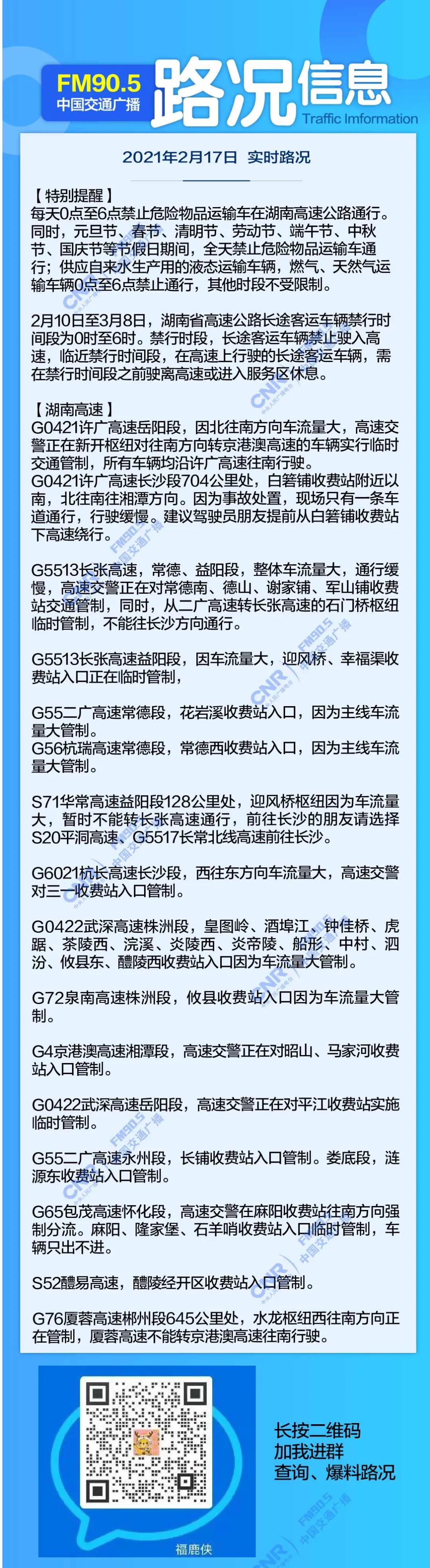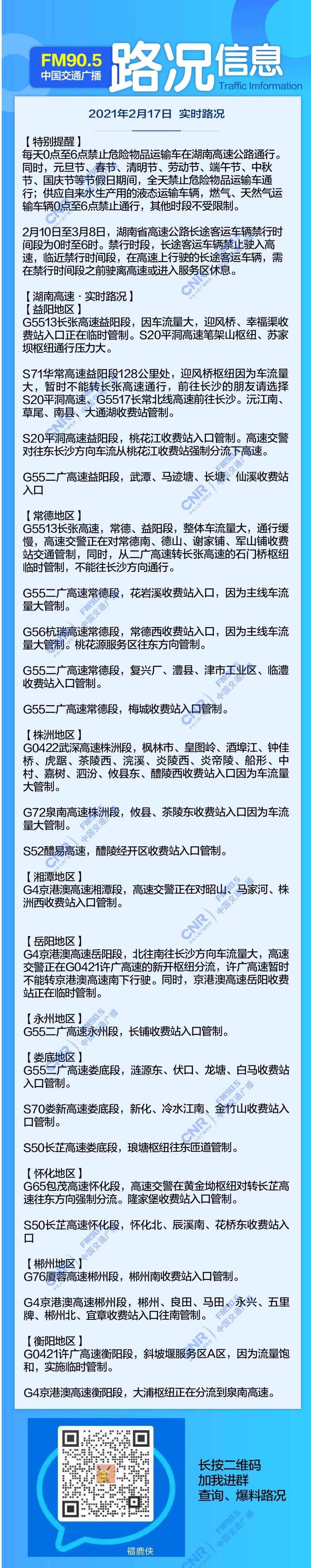 新湖南客户端2月17日讯 据905交通广播消息,截至今日21时30分,全省高速公路路况如下: