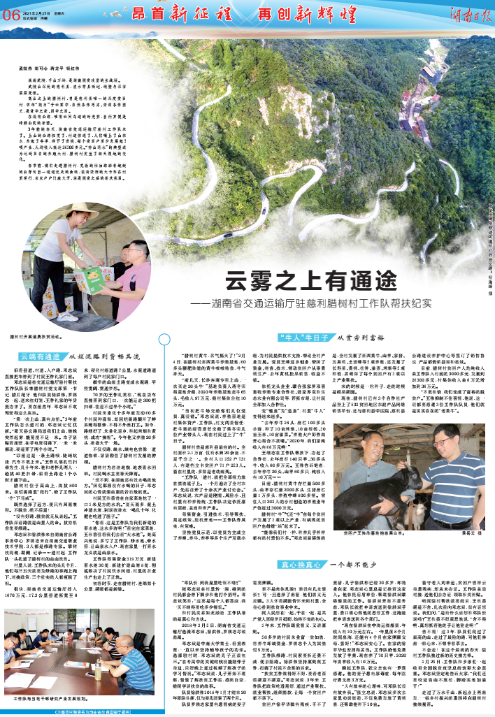 3年前的春天,湖南省交通运输厅驻村工作队来了。上山的公路拓宽了,村道修通了,人们喝上了山泉水,养起了牛羊,种下了黄桃,每个贫困户至少发展起3项产业,人均收入高达26300多元。“穷山恶水”的典型成为远近闻名的养殖大村,腊树村发生了翻天覆地的变化。