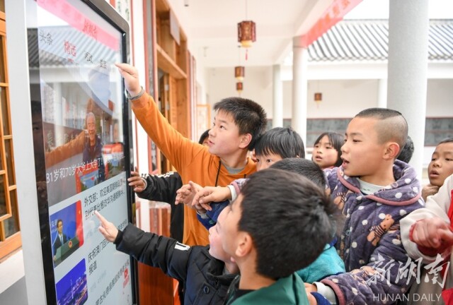 △2019年12月18日,曹家村老农活动中心,放学后的小朋友通过新湖南客户端的新闻大屏看新闻。 湖南日报记者 傅聪摄