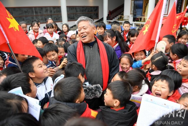 △2019年12月19日,曹家村老农活动中心,谭谈为小学生送上课外书籍,孩子们十分开心。 湖南日报记者 傅聪摄