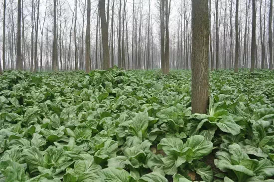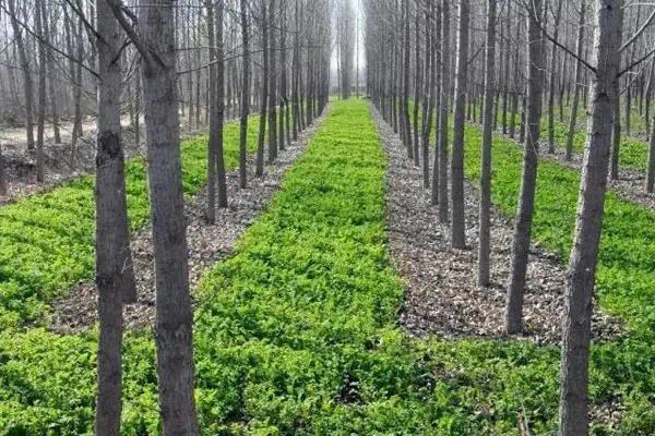 这种模式适用于1~2年树龄的速生林,此时树木小,遮光少,对农作物的影响小,林下可种棉花、小麦、绿豆、大豆、甘薯等农作物。