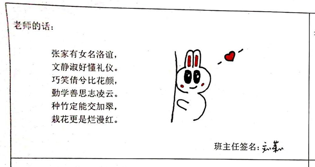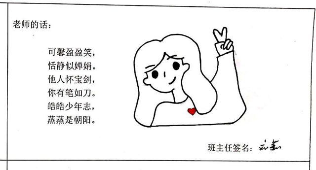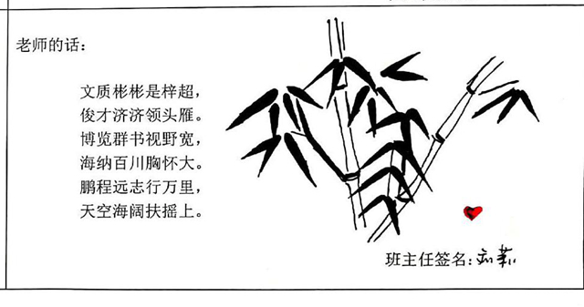 同时,我还给每个同学画了一幅简笔画。在平常的班级管理中,家校联系本是我与学生沟通的重要媒介之一。学生们都喜欢在联系本“成长感悟”一栏,写上与当日相关的只言片语。有时是学生面对考试的紧张,有时是他们对班级问题的表达,有时孩子们自己成长的困惑与烦恼……但无论书写什么,孩子们都很喜欢在句子旁边配画。这些画都很简单,但寥寥几笔,却能恰到好处地表情达意,十分形象。所以这一次,我也配了画。黑色作底,红色作心。有的是学生形象的简笔画,有的是与学生品质有关的植物画。我想,虽然图画简单,但是孩子们一定能从这些图画中,感受到我这个严厉的班主任与大家平等沟通的热情。