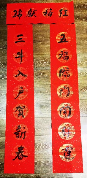 联语赏析:上联“五福”出自《书经·洪范》。五福,一曰寿,二曰富,三曰康寧,四曰攸好德,五曰考终命。作者用经典祝福语为家人祈福,祝福老人长寿,家人健康,同时勉励自己继续积德行善,相信好人好报。“开好运”特指圆梦晋级。