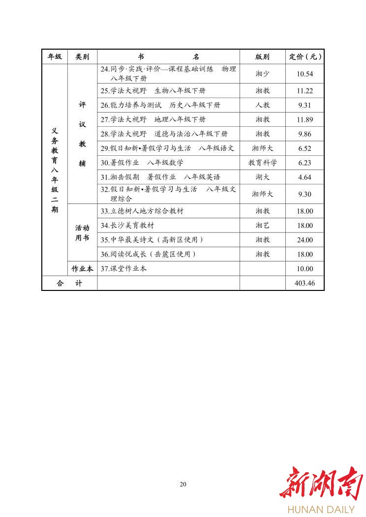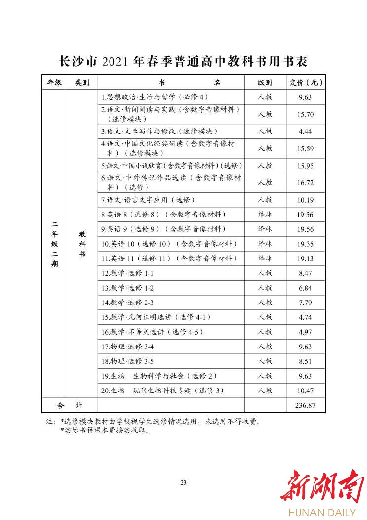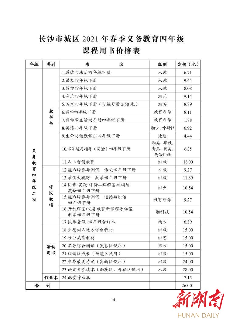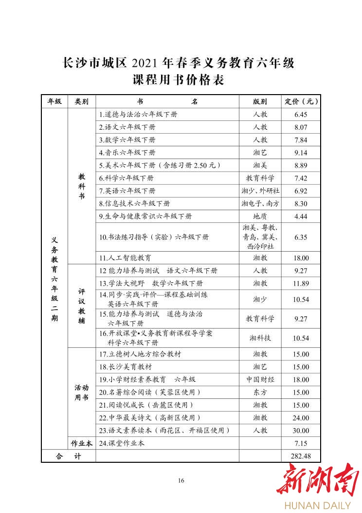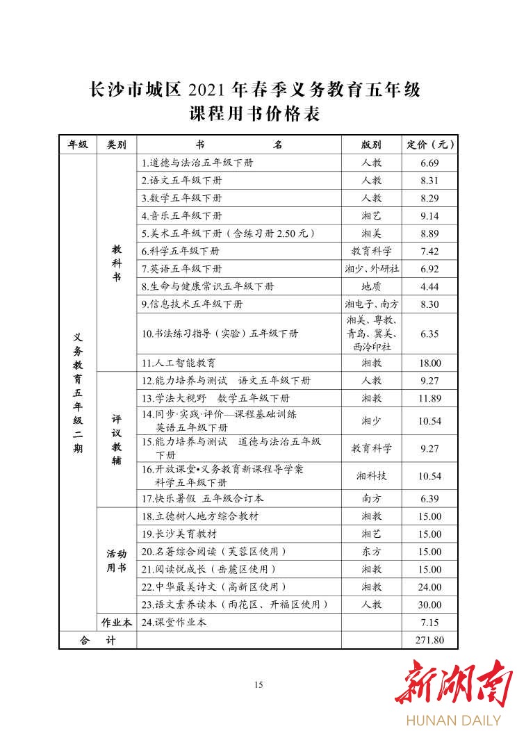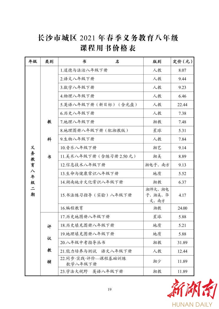 湖南日报·新湖南客户端2月22日讯(记者 金慧)今天,《长沙市2020年春季中小学收费标准的通知》(以下简称《通知》)发布,根据《通知》内容,2021年春季中小学课程设置和教材教辅价格都有相应变化。