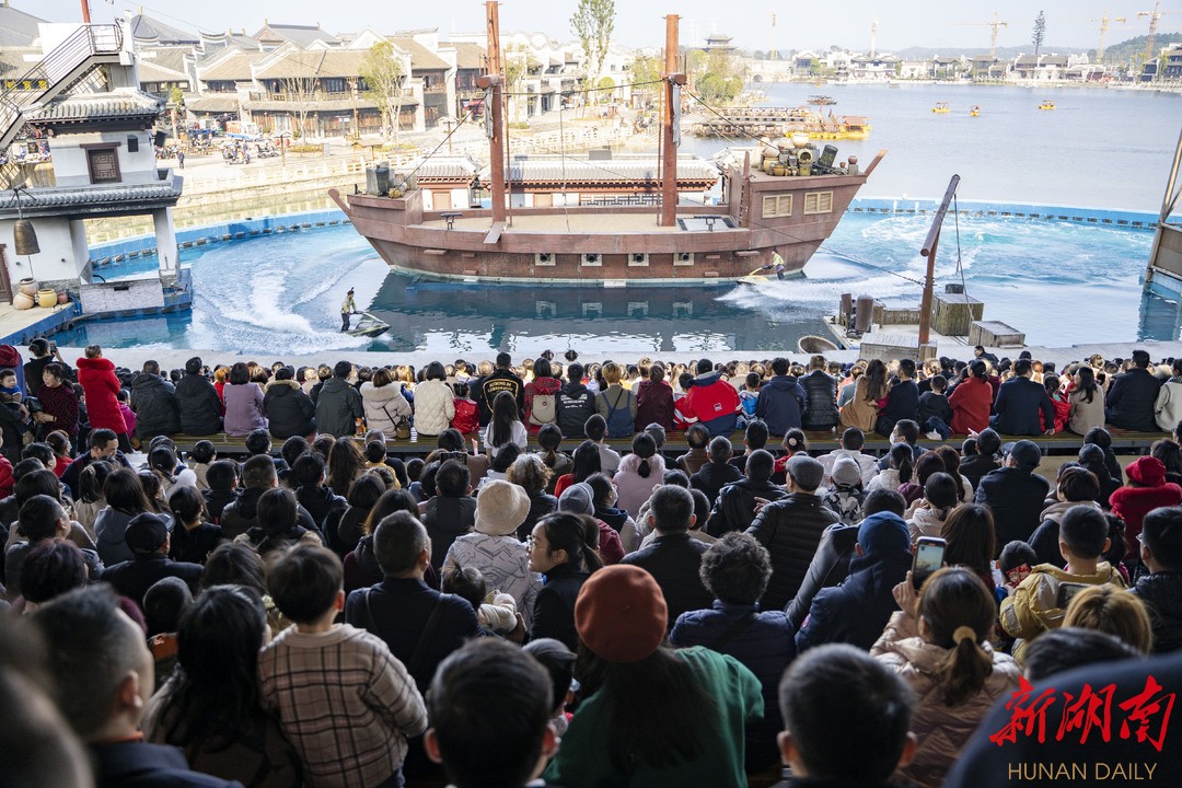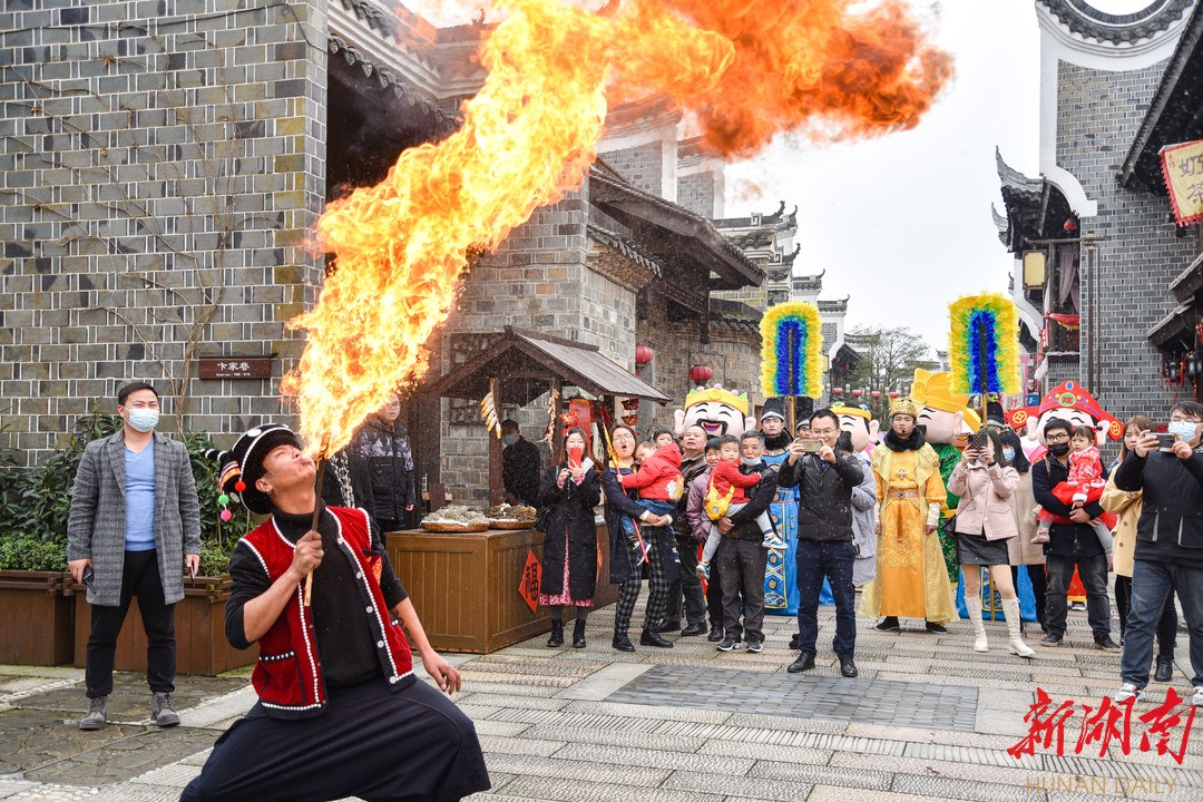 熙熙攘攘的人群、琳琅满目的商品、卖力吆喝的商家,其间掺杂着阵阵欢笑声、锣鼓声,这样热闹繁华的市集,或许只存在于老一辈的新春记忆中,但铜官窑古镇一一做了复原呈现。铜官草市里,游客不仅可体验打糍粑,购买干货与腊制品特产,还能参与特色长桌宴;舜子街上,完成投壶、套圈、画纸鸢、临摹春联等传统民间游戏后,就能获赠衙票兑换礼品;南岸小吃集市里,烤红薯、炒栗子、煎饼果子等各类美食香味侵袭鼻腔......从舞龙舞狮表演,到五福送福,再到每天四场的流动巡游,铜官窑古镇全天奉献演艺超过62场。