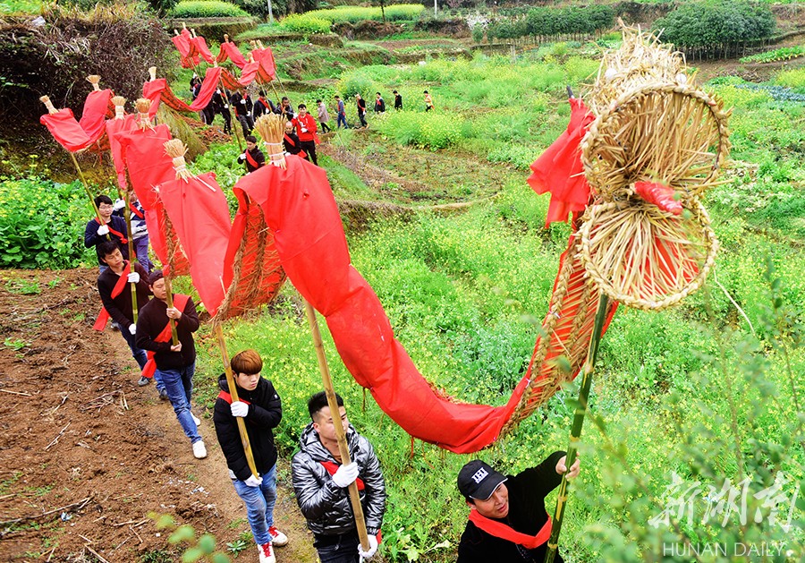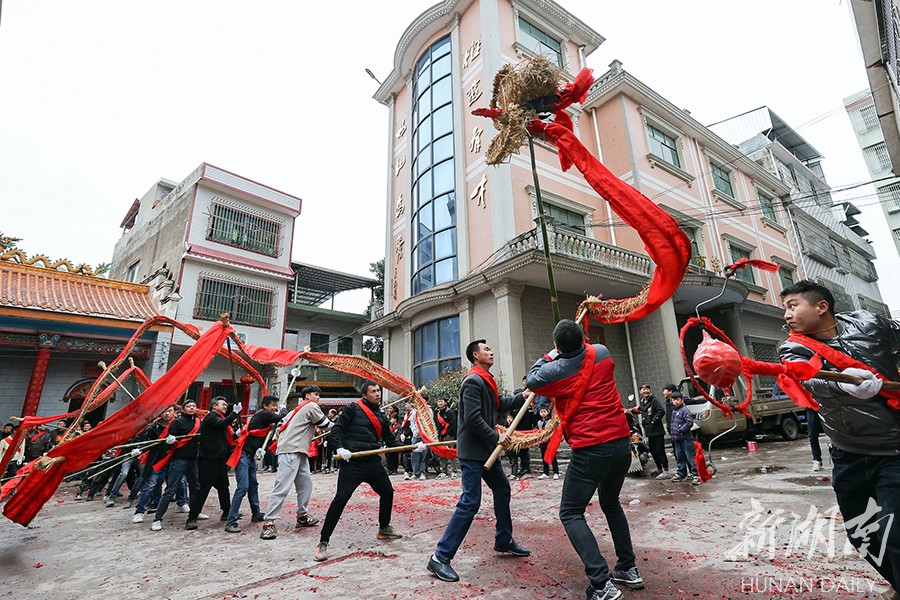 2月26日,临武县楚江镇楚市村,村舞龙队正为村民舞香龙。 陈卫平 摄