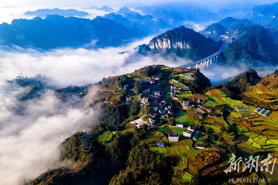 2月13日,吉首市石家冲街道庄稼村周边出现云海景观,与苗寨、山峦、高速公路相互辉映,美如画卷。 刘振军 摄