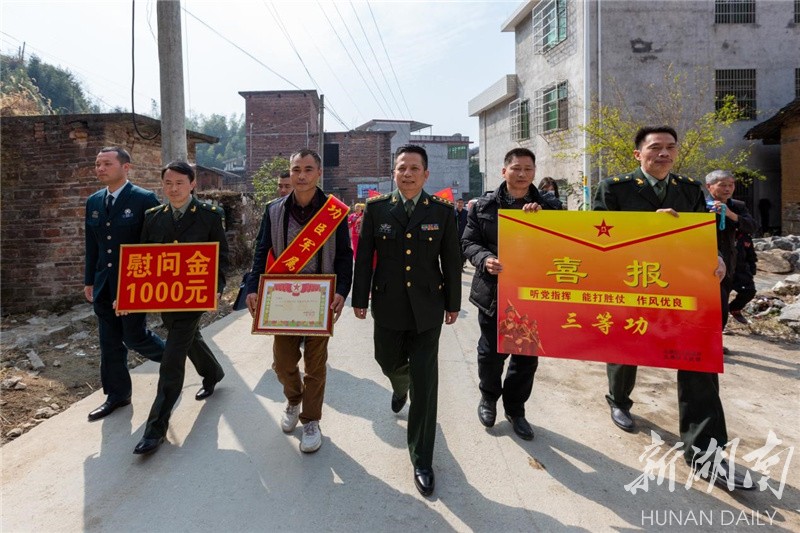 湖南日报·新湖南客户端2月2日讯(通讯员 黄志亮)“好样的,立功了!”“这孩子为我们村争了光!”1月31日,北湖区仰天湖瑶族乡安源村的宁静被一阵喜庆的锣鼓声打破,一派喜气洋洋里,夹道欢迎的群众们纷纷竖起大拇指,为功臣和军属鼓掌祝贺。
