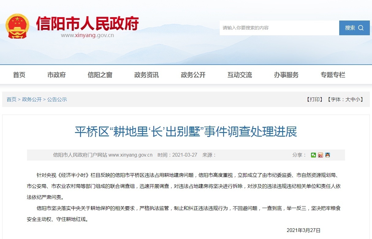 针对央视曝光侵占农村耕地开发房地产乱象,3月27日,河南信阳市人民政府在其官网发布了《平桥区“耕地里‘长’出别墅”事件调查处理进展》。公告全文如下: