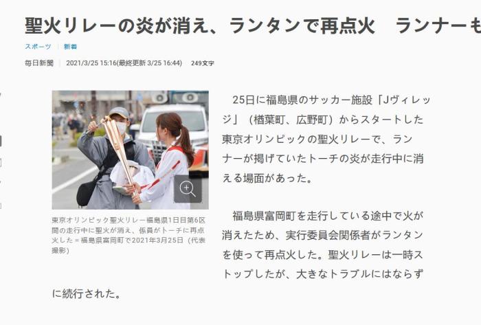 据日媒报道,火炬在富冈町传递时圣火意外熄灭,传递活动虽然暂时终止,但并没有造成太大麻烦,火炬很快被重新点燃。当值火炬手表示,“熄灭时吓了我一跳,好在马上就重新点好了。”