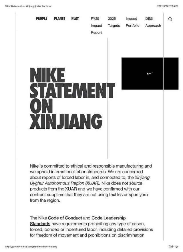 日本共同社今年2月的报道称,优衣库、无印良品等12家日本公司拟与“已确认在中国新疆维吾尔自治区参与强迫劳动的中国公司”暂停交易;耐克也曾在官网发表声明,宣称它的供货商不使用任何来自大新疆地区的纺织物及其加工品。