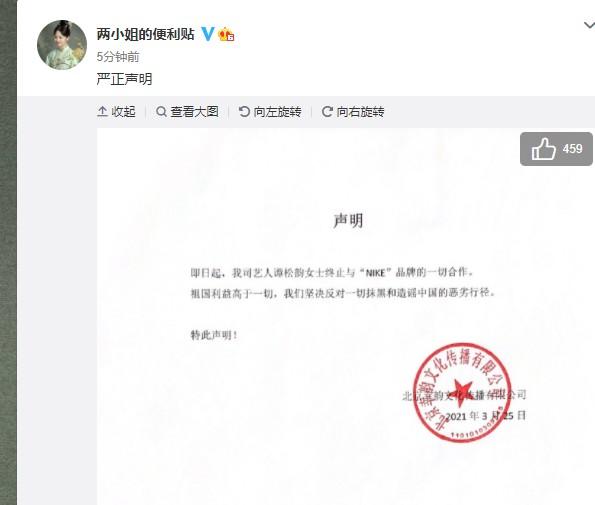 25日,@两小姐的便利贴发布声明,宣布@谭松韵seven终止与“NIKE”品牌的一切合作,“祖国利益高于一切,坚决反对一切抹黑和造谣中国的恶劣行径”!