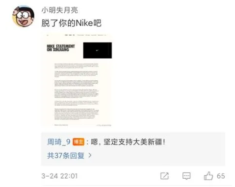 面对网友:“脱掉你的Nike吧。”的评论,周琦正面回应称:“嗯,坚定支持大美新疆!”