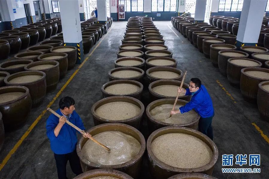 酿酒厂的工人进行“开耙”搅拌(无人机拍摄)。新华社记者 徐昱 摄