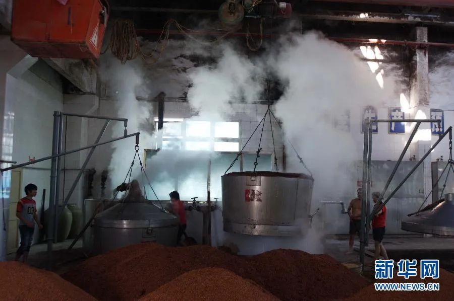 贵州茅台镇一酒厂职工在热气腾腾的蒸笼旁忙碌。新华社发(乔启明摄)