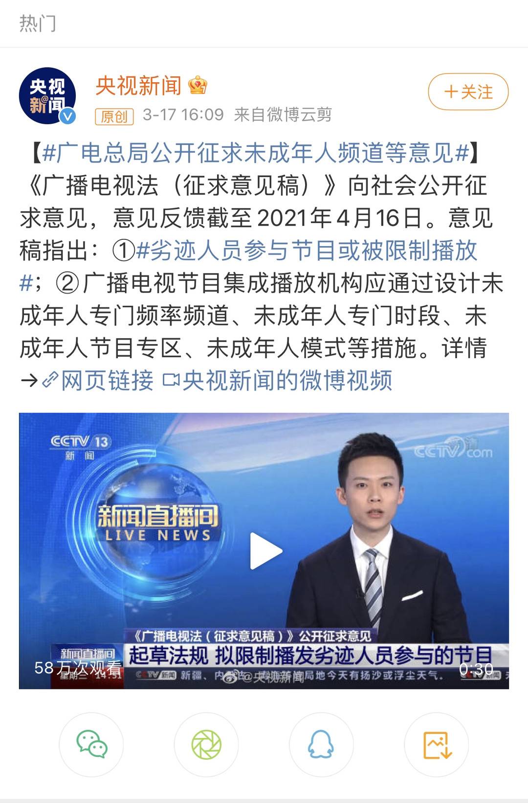 消息公布后不久,话题#限制播放劣迹人员参与的节目#便登上了微博热搜,并在网络中掀起网友的讨论。