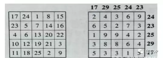 (5)用π的第n位数字去代替图14左图中的n,会得到一张图15右图所示的有趣的数表——各行、各列数字之和分别是5个相同的数.