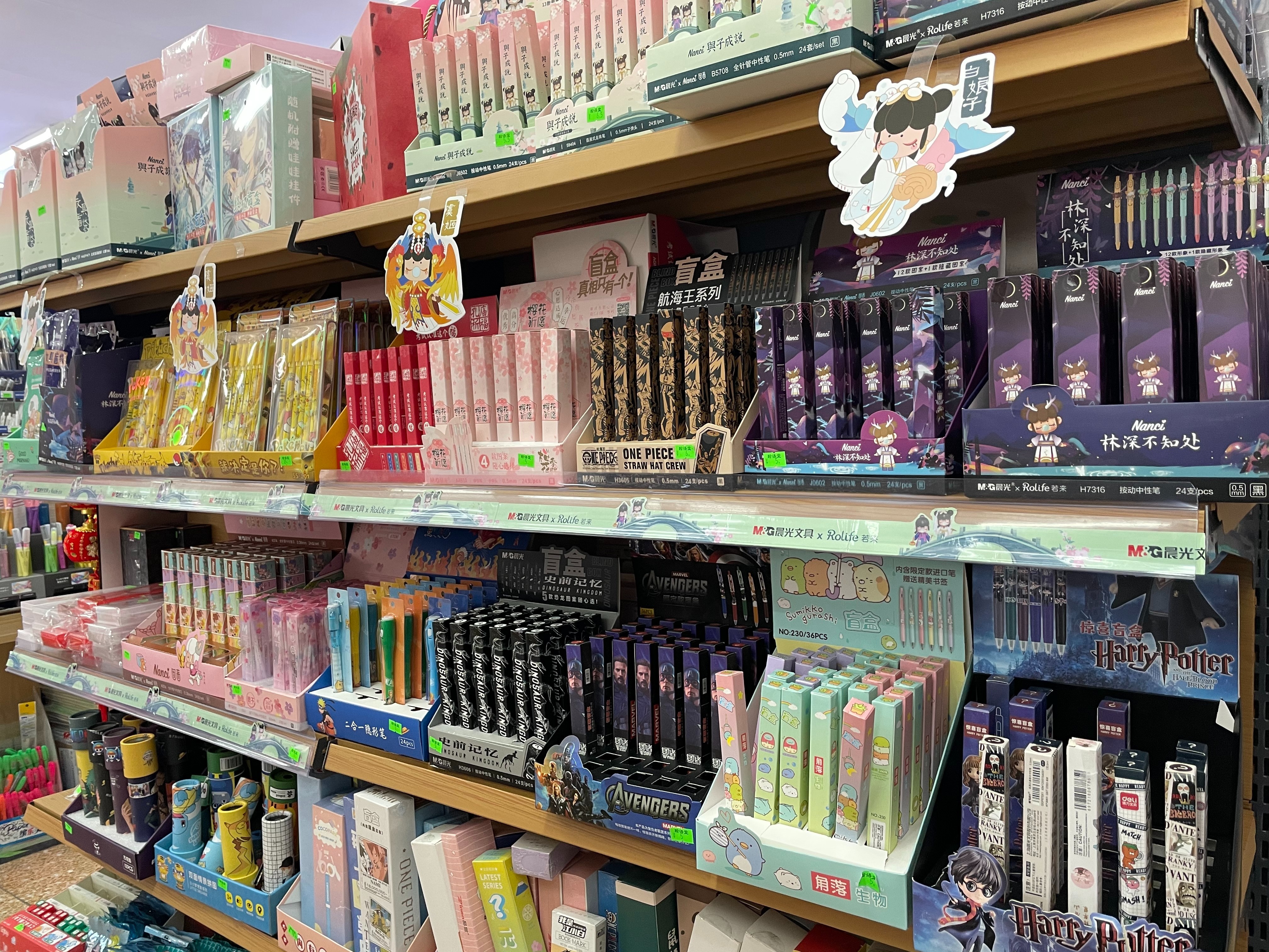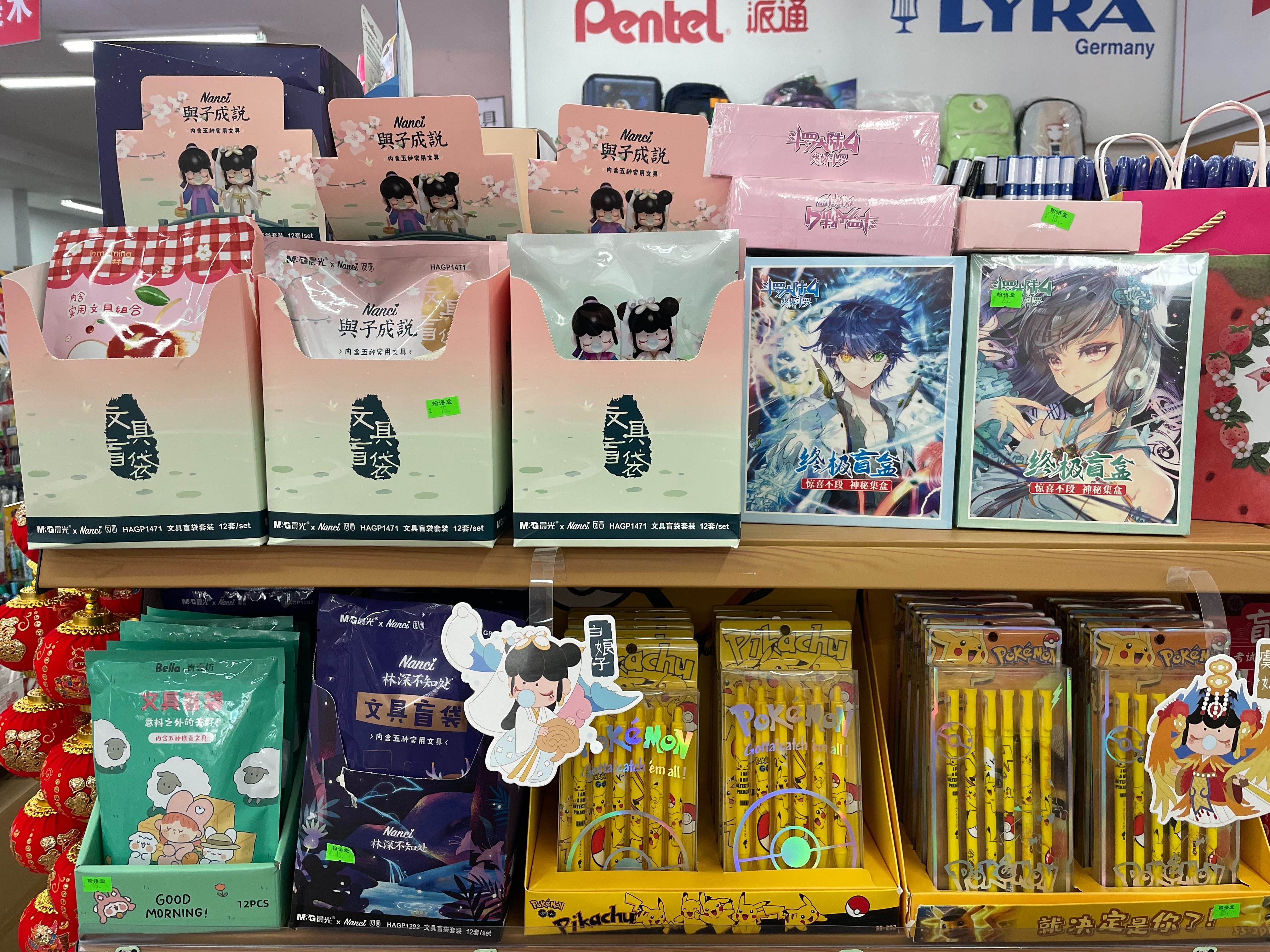 西城区新街口附近一家规模较大的连锁文具店,各种包装精美的文具盲盒摆在一进门靠前的货架上。柯南、哈利·波特、复仇者联盟等深受孩子们喜爱的人物形象,都被印在了文具盲盒的包装上,还印着大大小小的问号和“惊喜不断”等图案和字样,价格在5元到30元不等。