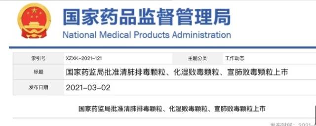 3月2日,国家药品监督管理局通过特别审批程序应急批准中国中医科学院中医临床基础医学研究所的清肺排毒颗粒、广东一方制药有限公司的化湿败毒颗粒、山东步长制药股份有限公司的宣肺败毒颗粒上市。