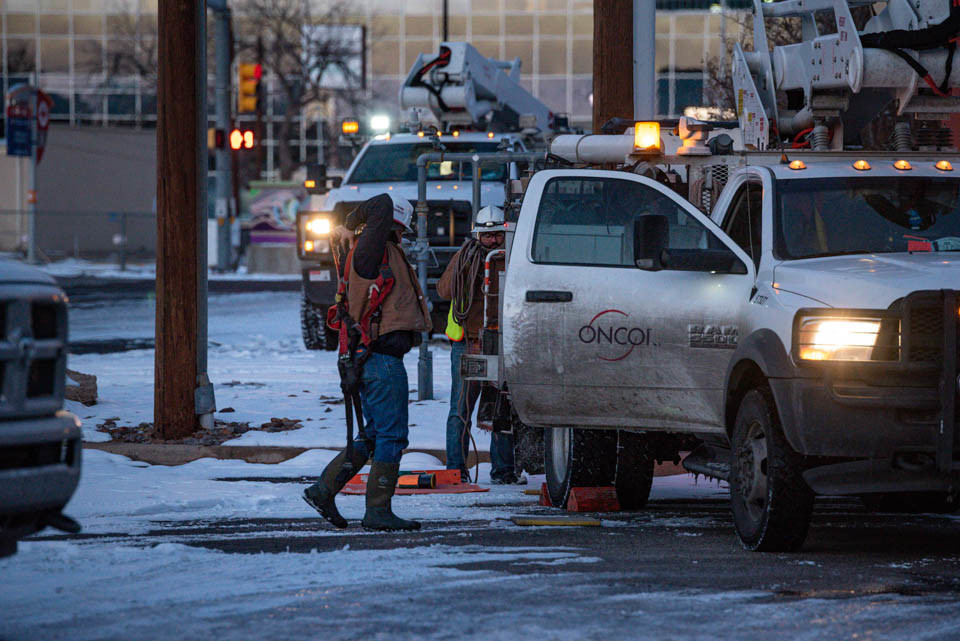 2021年2月18日,工人们在美国得克萨斯州敖德萨准备修理电线杆。 新华社 图