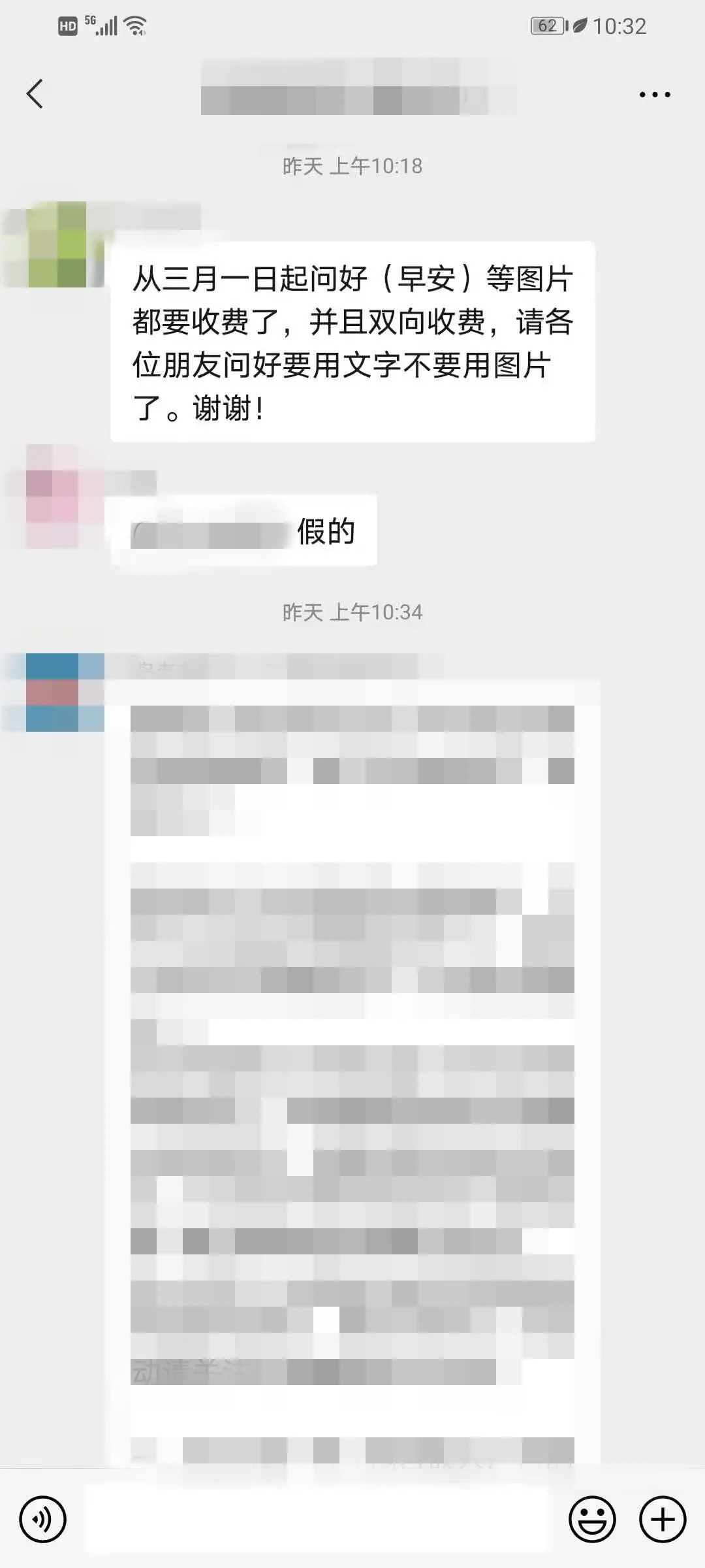 该消息称:“从三月一日起问好(早安)等图片都要收费了,并且双向收费,请各位朋友问好要用文字不要用图片了。谢谢!”