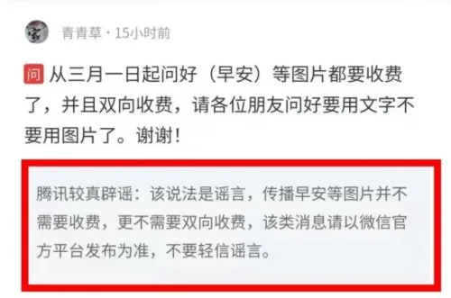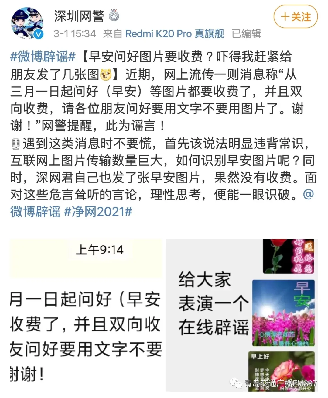 另外,3月1日,深圳网警发布《早安问好图片要收费?吓得我赶紧给朋友发了几张图》对该网传消息进行辟谣。