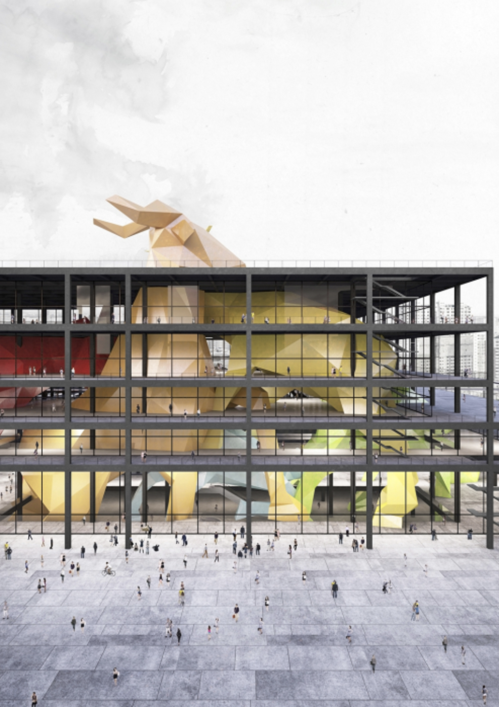 AL:是的,一个21世纪建筑的标志。对我们来说,标志性的东西从来不是建筑,而是它里面的东西。通常情况下,就像东京宫一样,我们认为建筑中最壮观的部分是发生在里面的动作和程序。我们在玩的是把一个偶像放在里面意味着什么,所以我们选择在那里放一个Adriana Karembeu的巨大雕像。她是一个顶级的模特,她为一些人权组织工作,她还嫁给了一个著名的足球运动员。作为一个形象,作为一个符号,她是一个偶像。