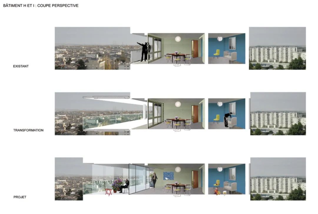 Q: 在Tour Bois-le-Prêtre(2011)项目中,你们在一天之内给巴黎边缘的住宅区的每套公寓都做了相当大的扩建。因此,租户早上出门上班,晚上到家就能看到自己的公寓变大了,而且有了新的落地窗。这样做的同时,还向租户保证,他们的能源消费将减半,并向住房委员会保证,扩建工程将比按原计划拆除建筑更便宜。这是通过在大楼的两个外墙增加一个冬季花园的网格来实现的,这是怎么做到的?