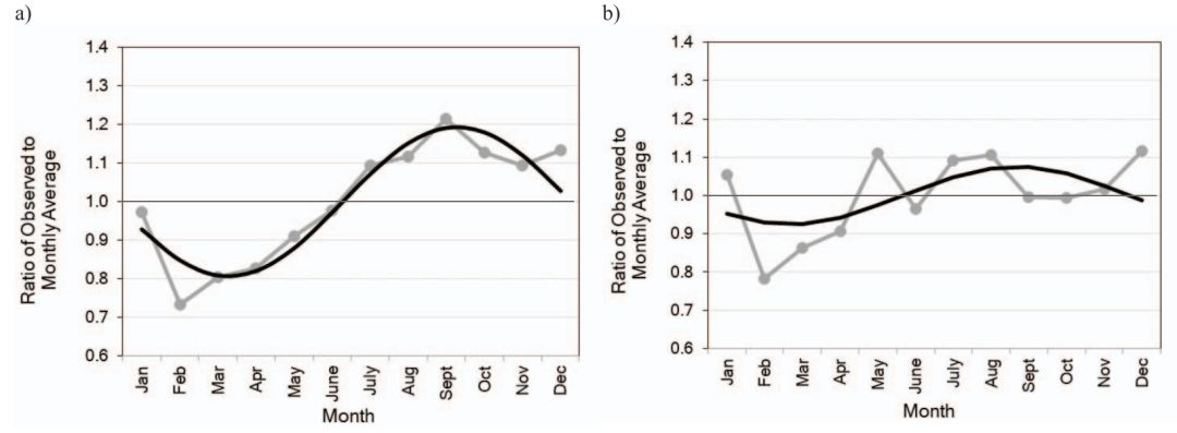 在获取数据之后,研究团队对夫妻开始受孕的季节性模式展开了探究,结果表明,妇女的生育力在春末会下降,而在秋末达到了顶峰,如下图所示,其中,下图a是PRESTO调查的妇女数据,而图b是SG/SF调查的妇女数据,可以看出,这种周期变化趋势在低纬度地区(PRESTO)的夫妻之间更为显著!注:“可生育性”是指在一个月经周期内受孕的几率。
