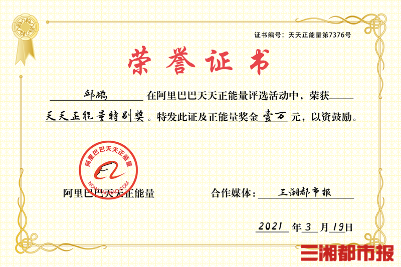3月18日,在了解邱鹏的故事后,阿里巴巴天天正能量工作人员致电三湘都市报,双方共同商定授予邱鹏“天天正能量特别奖”,并奖励1万元正能量奖金,帮助他实现自己的心愿。