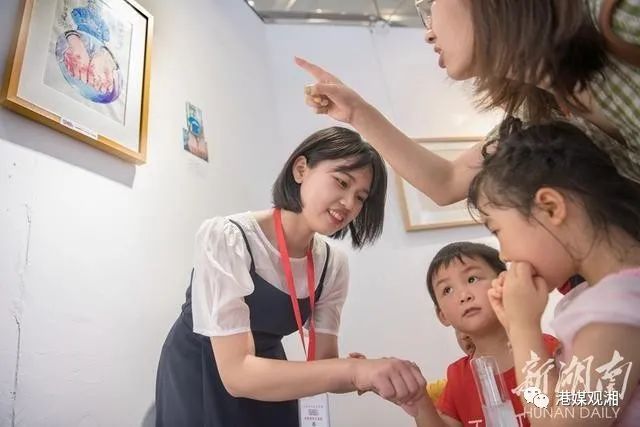 (取下口罩的胡佩在以她的双手创作的画作前和小朋友互动)