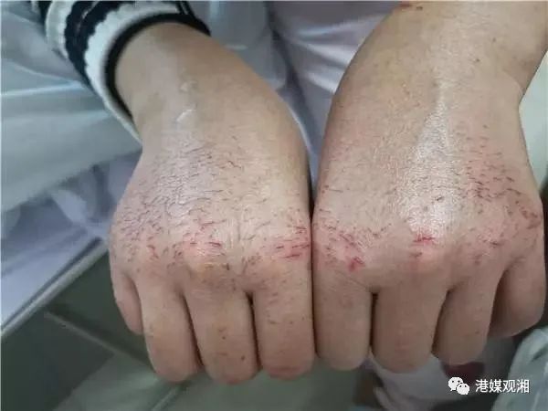 这是一位“长沙小姐姐”的双手,放在平时,它们应该白皙漂亮,可能还会涂上鲜艳的指甲油,但当时上面只有道道血痕纵横交错,让人泪目。