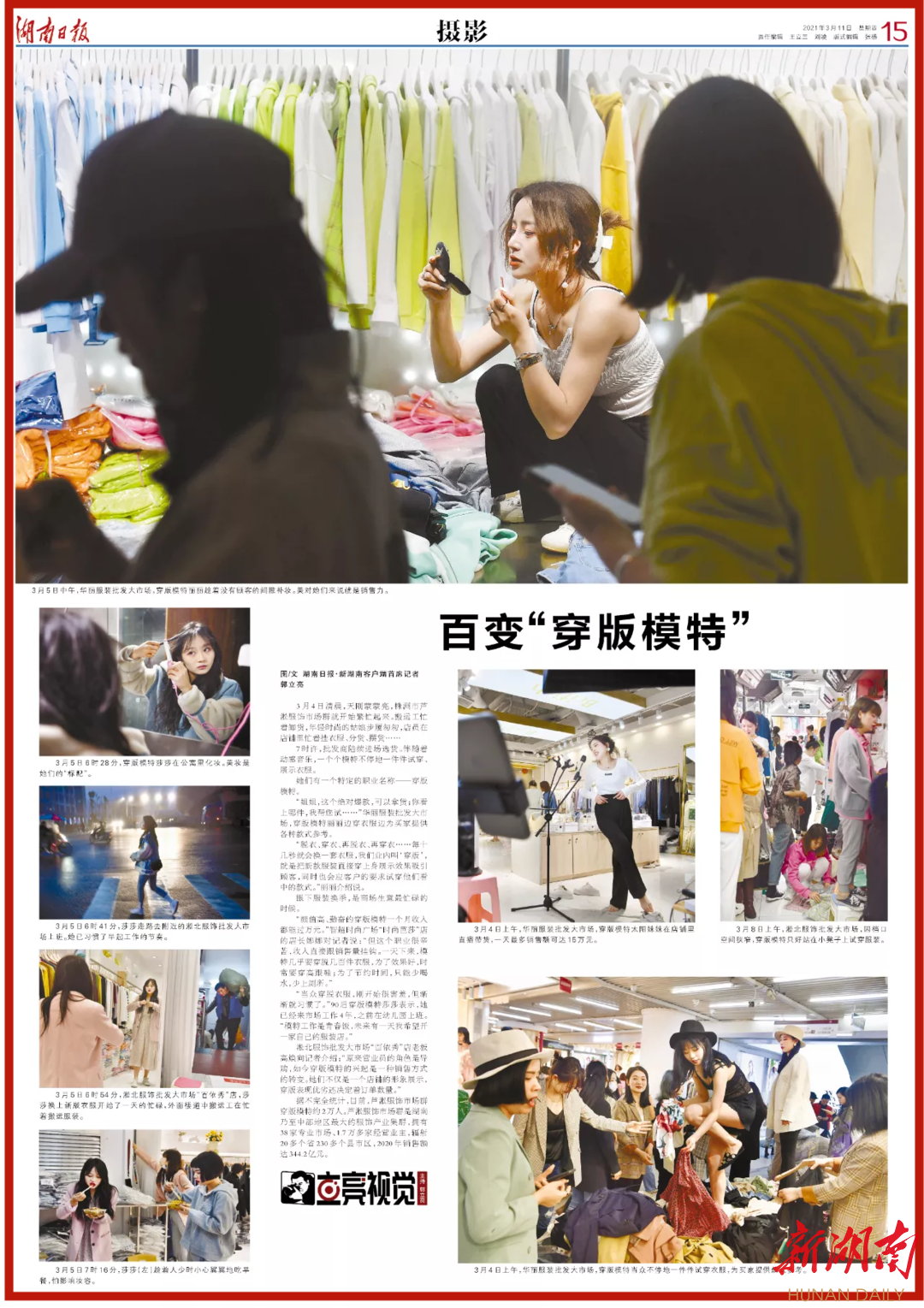 “脱衣、穿衣、再脱衣、再穿衣……每十几秒就会换一套衣服,我们业内叫‘穿版’,就是把新款服装直接穿上身展示效果吸引顾客,同时也会应客户的要求试穿他们看中的款式。”丽丽介绍说。